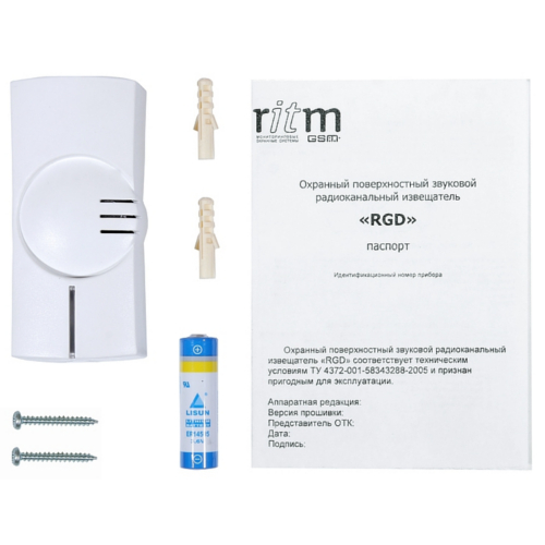 Ritm RGD1 - охранный поверхностный звуковой радиоканальный извещатель, который предназначен для работы в составе радиоканальной системы «Контакт» в качестве датчика разбития стекла. Извещатель RGD формирует сигнал основной тревоги, тревоги дополнительного шлейфа, тревоги тампера вскрытия корпуса и сообщение о разряде батареи и передаёт их на панель. При получении сигнала от извещателя панель формирует сигнал тревоги.