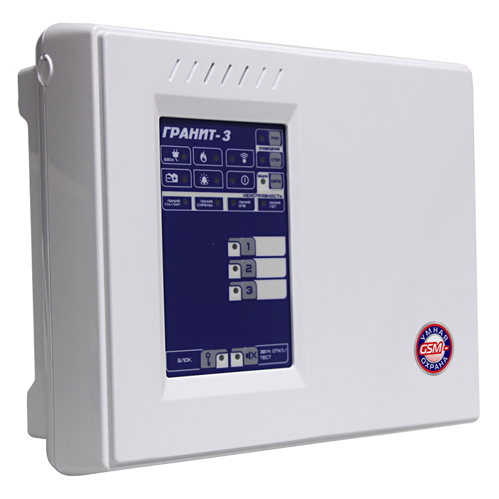 Гранит-3А GSM – прибор предназначен для охраны небольших объектов (квартир, коттеджей, офисов, магазинов и т.д.). Имеет 3 шлейфа сигнализации для подключения пожарных и/или охранных извещателей. Прибор отправляет тревожные и служебные сообщения на мобильный телефон владельца через сотовую сеть GSM.