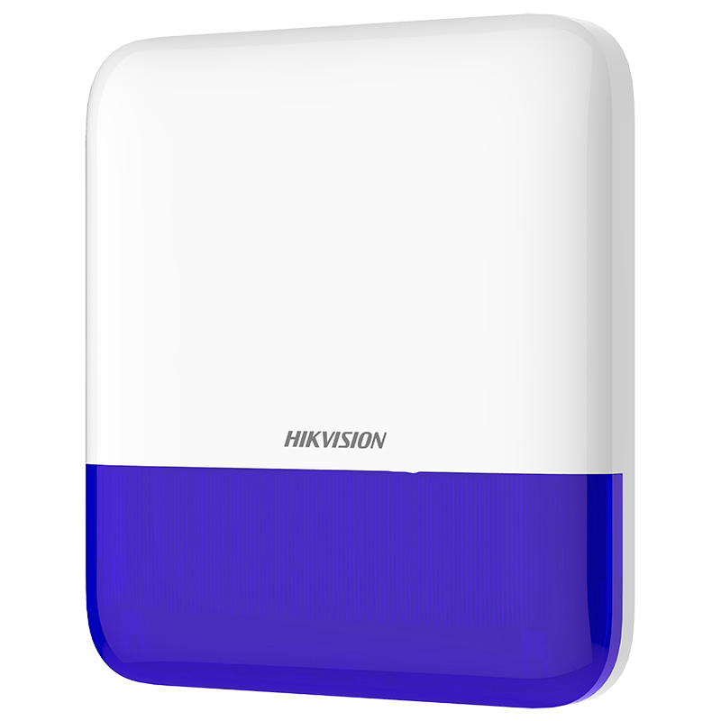 SirenOut blue (DS-PS1-E-WE) – беспроводная сирена для установки снаружи помещений с поддержкой беспроводной связи 868 МГц, беспроводным протоколом Tri-X, несколькими методами регистрации, двусторонней беспроводной связью, несколькими звуковыми сигналами тревоги и стробоскопом.
