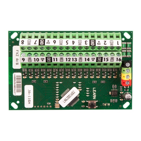 JA-116H – модуль для подключения 16 входов к шине системы JABLOTRON 100. Способ подключения можно выбрать для каждого входа отдельно.