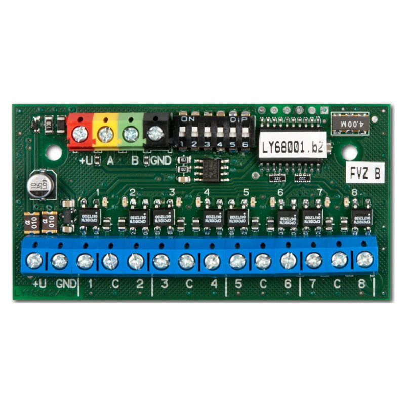 JA-118N – 8-канальный адресный релейный модуль, который обеспечивает передачу статуса системы в 8 разделах, срабатывание внутренней и уличной сирены в 8 разделах или состояние до 8 PG выходов. Выходы изолированы от шины, регистрация осуществляется DIP переключателями.