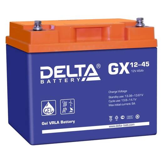 GX 12-45 – герметизированный, необслуживаемый свинцово-кислотный аккумулятор, изготовлен по технологии GEL. В качестве электролита используется композитный гель - загущенный раствор серной кислоты, что обеспечивает устойчивость аккумуляторов к глубоким разрядам и высокую температурную стабильность, а также увеличивает число циклов заряда/разряда, и продолжительность работы в тяжелых режимах систем на базе возобновляемых источников энергии.