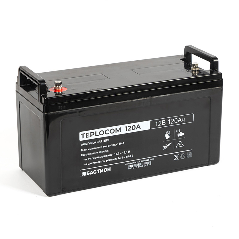 TEPLOCOM 120Ач – аккумулятор герметичный свинцово-кислотный необслуживаемый, производимый по технологии AGM, предназначен для использования в составе системы резервного питания.