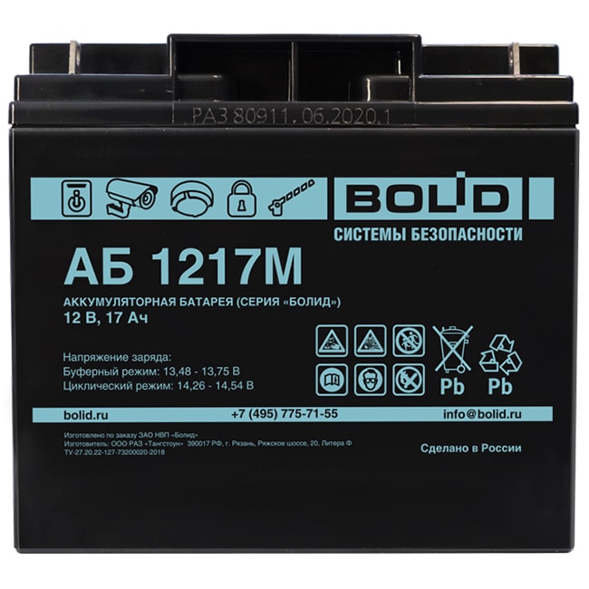 АБ 1217М – аккумулятор стационарный свинцово-кислотный с регулирующим клапаном для применения в резервированных источниках питания (РИП), приборах приемно-контрольных, шкафах оборудования пожарной автоматики, и другом сложном оборудовании систем безопасности, более требовательном к характеристикам и продолжительности срока службы аккумуляторных батарей.
