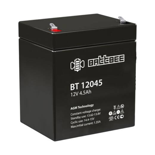 BT 12045 – стационарный аккумулятор разработан специально для охранно-пожарных систем, он может использоваться в буферном и циклическом режимах. Корпус представляет из себя запаянный моноблок из химически стойкого ABS пластика, аккумулятор герметичен, долив воды не требуется на протяжении всего периода эксплуатации. Односторонние клапаны располагаются на крышке батареи и позволяют поддерживать давление необходимое для рекомбинации газов. Технология AGM (стекловолоконные сепараторы, удерживающие электролит неподвижно) повышают устойчивость к воздействию температур.