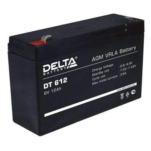 DT 612 – герметизированный VRLA свинцово-кислотный аккумулятор напряжением 6В, емкостью 12 Ач, разработанный для эксплуатации в слаботочных системах. Изготавливается по технологии AGM (электролит, абсорбированный в стекловолоконном сепараторе).