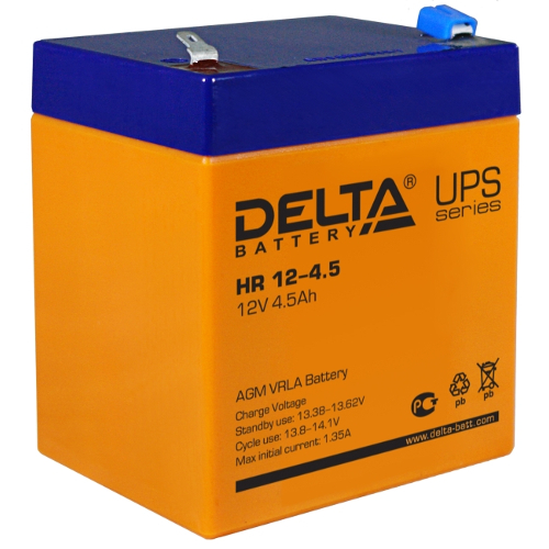 HR 12-4.5 – герметизированный необслуживаемый свинцово-кислотный аккумулятор напряжением 12В, емкостью 4.5 Ач с системой рекомбинации газов (VRLA). Изготавливается по технологии AGM (электролит, абсорбированный в стекловолоконном сепараторе), благодаря которой аккумулятор не требует долива дистиллята на протяжении всего срока службы. Аккумулятор относится к линейке DELTA UPS series, разработанной специально для использования в источниках бесперебойного питания.