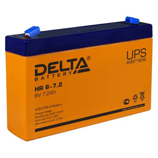HR 6-7.2 – герметизированный необслуживаемый свинцово-кислотный аккумулятор напряжением 6В, емкостью 7.2 Ач с системой рекомбинации газов (VRLA). Изготавливается по технологии AGM (электролит, абсорбированный в стекловолоконном сепараторе), благодаря которой аккумулятор не требует долива дистиллята на протяжении всего срока службы. Аккумулятор относится к линейке DELTA UPS series, разработанной специально для использования в источниках бесперебойного питания.