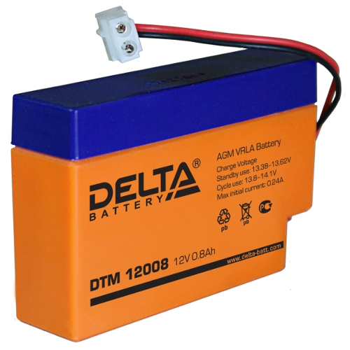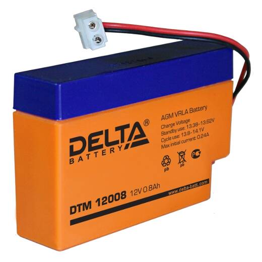 DTM 12008 – герметизированный необслуживаемый свинцово-кислотный аккумулятор напряжением 12В, емкостью 0.8 Ач с системой рекомбинации газов (VRLA). Изготавливается по технологии AGM (электролит, абсорбированный в стекловолоконном сепараторе). Рекомендован для использования как в буферном, так и в циклическом режимах работы. Предназначен для применения в переносных и портативных приборах, подходит для использования в источниках резервного энергоснабжения и блоках резервного питания.
