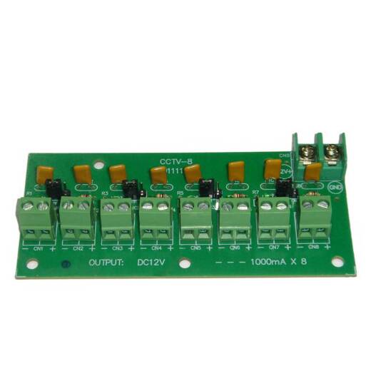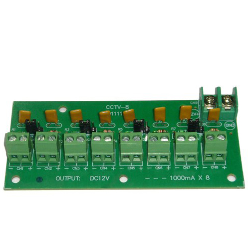 CCTV-8 – защитно-коммутационное устройство для распределения тока от источника питания по 8-ми каналам. Данное устройство обладает защитой по току и индикацией каждого из каналов. Используется совместно с бесперебойным блоком питания ББП-80 (исп.1), обеспечивая ток по каждому из каналов равный 1А.