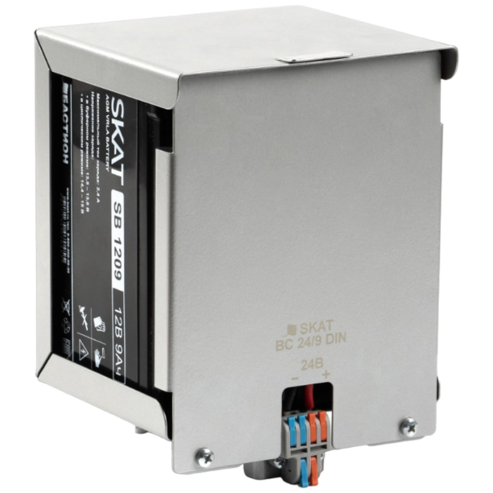 SKAT BC 24/9 DIN – батарейный блок предназначен для совместной работы с источниками бесперебойного питания SKAT DIN с напряжением 24 В и размещается на DIN-рейке.