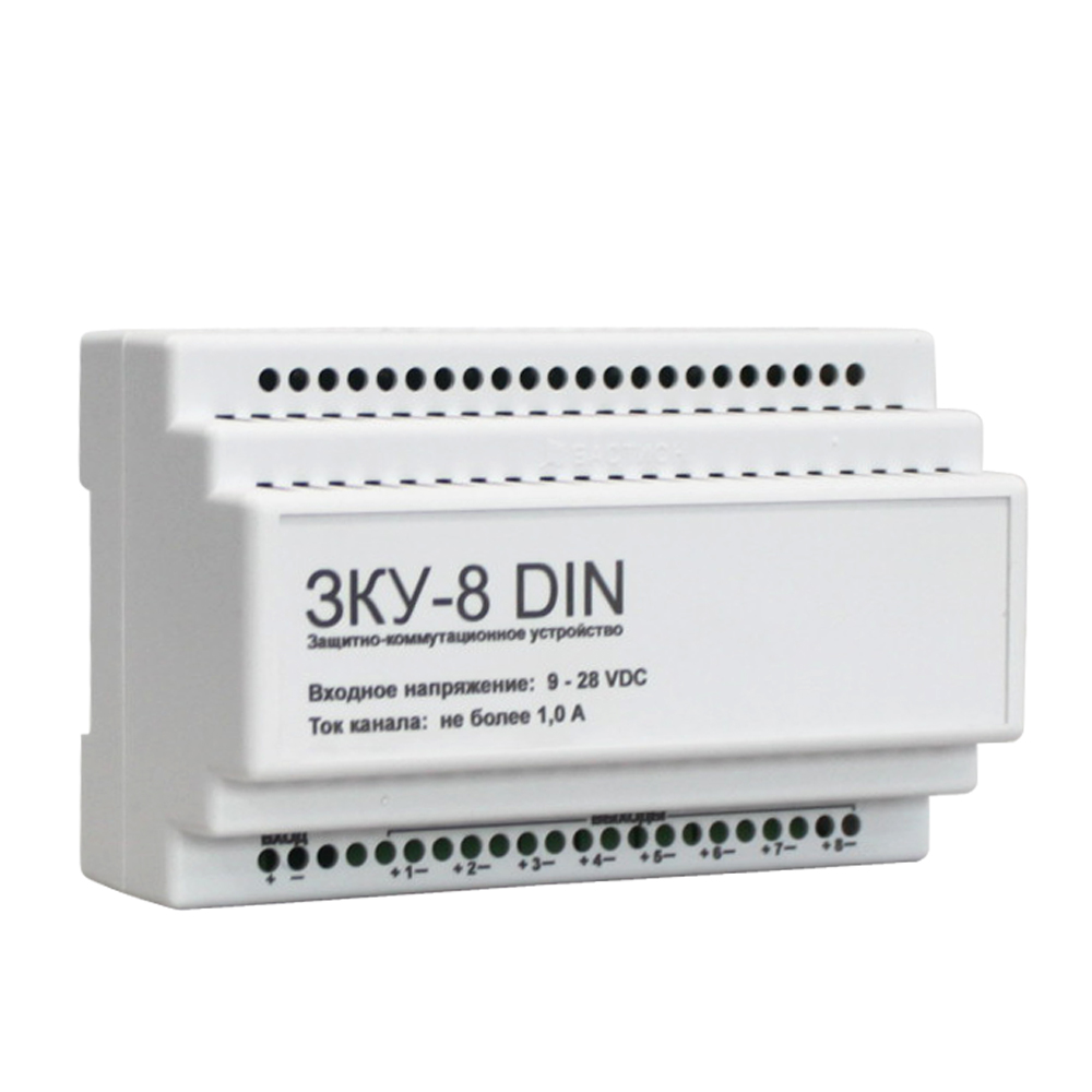ЗКУ-8 DIN – защитно-коммутационное устройство, предназначено для распределения тока источника питания аппаратуры ОПС по 8 каналам и защиты каждого канала по току при помощи самовосстанавливающихся предохранителей. ЗКУ выпускается в исполнении на DIN-рейку 35мм и легко монтируется в стойки и электротехнические шкафы.