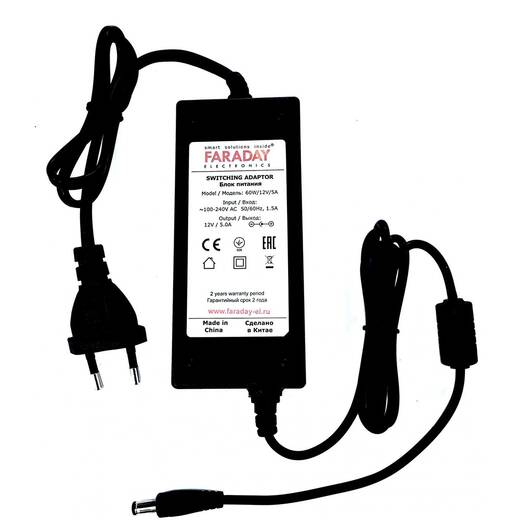 - выходные параметры: мощность 60W, напряжение 12V, ток 5.0А;