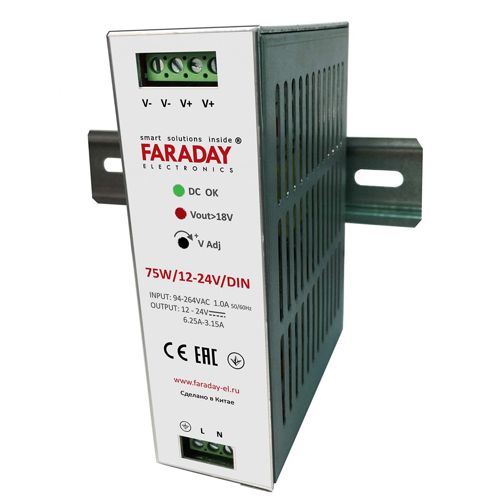 75W/12-24V/DIN – блок питания импульсный с автоматической защитой от перегрузок и перегрева. Устройство оснащено световой индикацией: зеленый светодиод горит - норма, мигает - сработала защита.