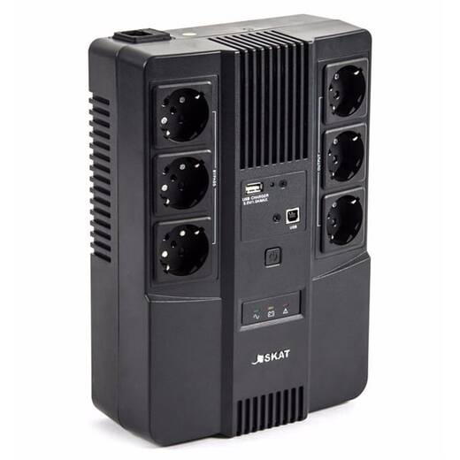 SKAT-UPS 800-AI-IN-1x9 (SKAT-UPS 800 AI) – источник бесперебойного питания 220 В, 800 ВА (480 Вт), встроенный АКБ 9 Ач, время резерва 3 минуты, холодный старт, модифицированный синус, световая и звуковая индикация режимов работы, связь и управление ПК по USB.