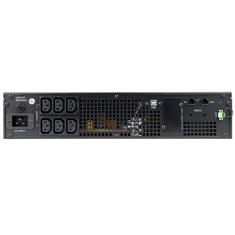 Наличие встроенных аккумуляторных батарей обеспечивает необходимое время резерва для подключеннной нагрузки. Оснащен функцией экстренного отключения EPO, что защищает оборудование от повреждений при чрезвычайных ситуациях.