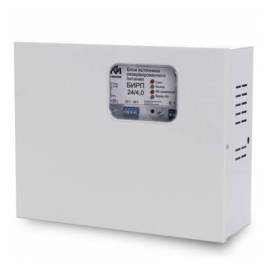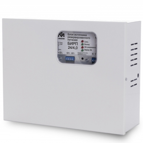 При отключении сетевого напряжения БИРП-24/4,0 обеспечивает питание нагрузки от резервного источника электропитания – аккумуляторной батареи (в комплект не входит). Продолжительность автономной работы от аккумуляторной батареи при номинальной выходной мощности составляет 2.5 часа.