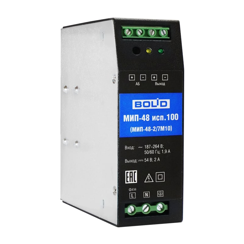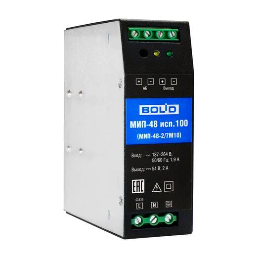 МИП-48 исп.100 – источник питания, предназначен для резервированного питания устройств автоматики, измерительного оборудования, телекоммуникационных систем, систем контроля доступа и видеонаблюдения, для размещения внутри монтажных устройств (шкафы, боксы и т.п.) на DIN-рейку.