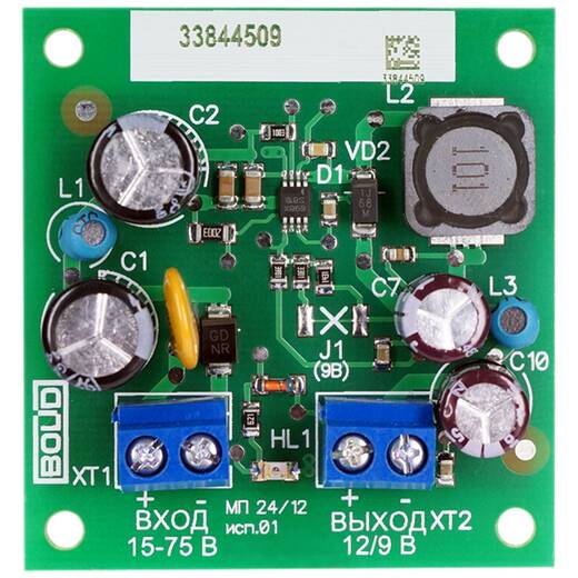 МП 24/12 В исп.01 – модуль преобразователя, предназначен для питания видеокамер (в т.ч. наружного наблюдения), извещателей, приемно-контрольных приборов охранной и охранно-пожарной сигнализации и других потребителей напряжением 12В или 9В постоянного тока.