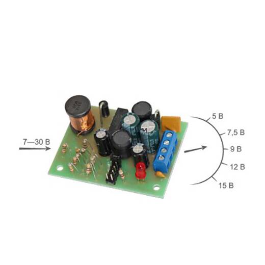 УПН-01 – универсальный преобразователь входного напряжения от 7 до 30В в фиксированное выходное напряжение 5, 7.5, 9, 12, 15В, максимальный ток 1.5А. Преобразователь представляет собой встраиваемый модуль на печатной плате размером 49х64мм. На плате расположены входная и выходная соединительные колодки, индикатор выхода, переключатель выходного напряжения.