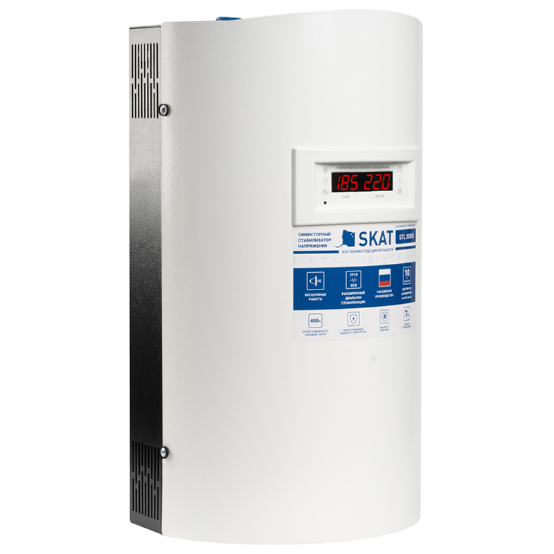 SKAT STL-20000 исп. Н – стабилизатор напряжения с симисторными ключами управления, разработан для защиты электрооборудования от перепадов напряжения.