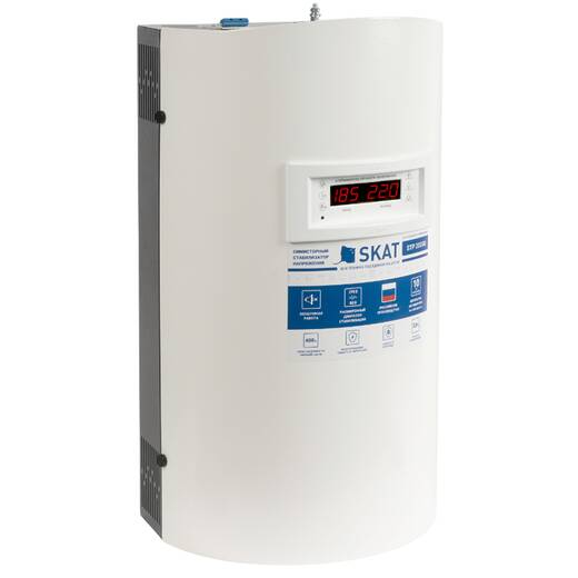 SKAT STP-20000 исп. Н – стабилизатор напряжения с симисторными ключами управления, предназначен для стабилизации напряжения сети в целях повышения качества энергоснабжения бытовой техники и инженерного оборудования.
