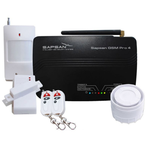 Sapsan GSM Pro 4 – GSM сигнализация с возможностью использования в неотапливаемых помещениях, позволяющая подключить беспроводные и проводные датчики, имеющая реле для дистанционного управления любым оборудованием, голосовое меню, встроенный аккумулятор (12ч).