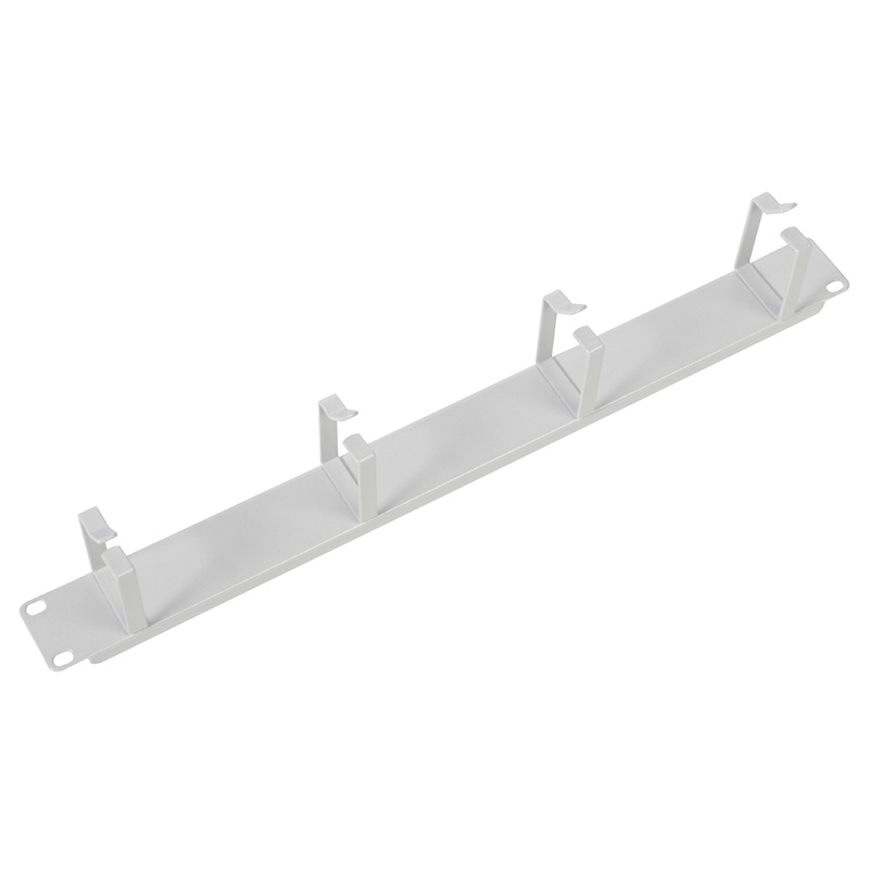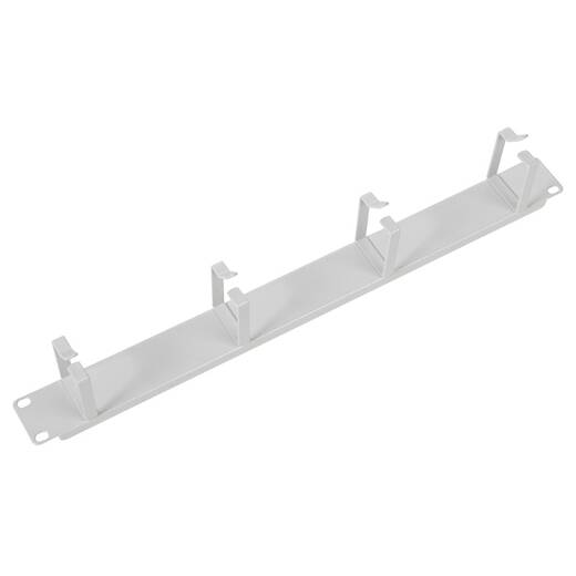 Выполнен из цельнометаллической панели высотой 1U. На лицевой стороне органайзера размещены 4 металлических кольца для фиксации кабеля.