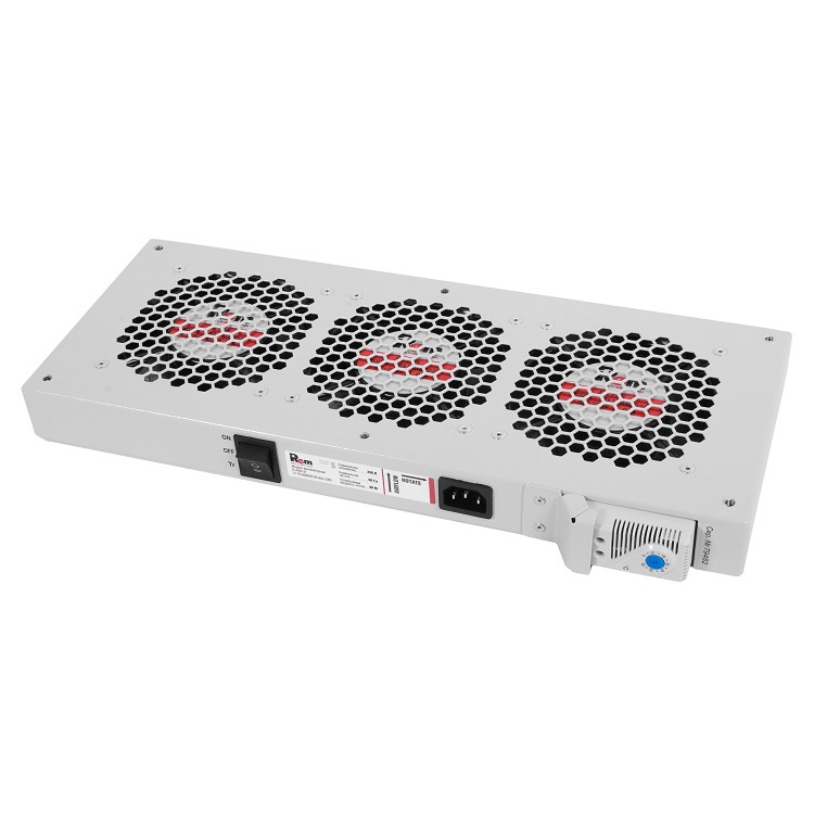 Модуль вентиляторный R-FAN-3T с тремя односкоростными, осевыми вентиляторами с изменением направления потока (направление потока указано на этикетке стрелкой) и терморегулятором. Порог включения задается в пределах от 0 до +60°С, порог выключения - понижение температуры на 7°С от заданной.