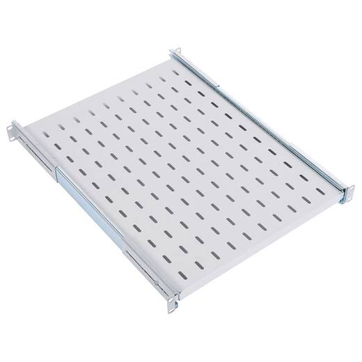 Имеет телескопические направляющие, обеспечивающие плавное выдвижение. Монтажные кронштейны фиксируют полку к вертикальным направляющим шкафов и стоек в 4 местах. Глубина монтажных кронштейнов регулируется, что позволяет устанавливать полку на необходимую глубину.