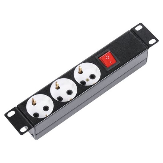 БР-3П-10-9005 – блок силовых розеток без шнура с выключателем. Имеет три розетки, выполнен в металлическом корпусе. Предназначен для размещения в 10” шкафах. Розетки расположены горизонтально, для удобного подсоединения коленчатых штекеров. На лицевой части блока установлен выключатель.