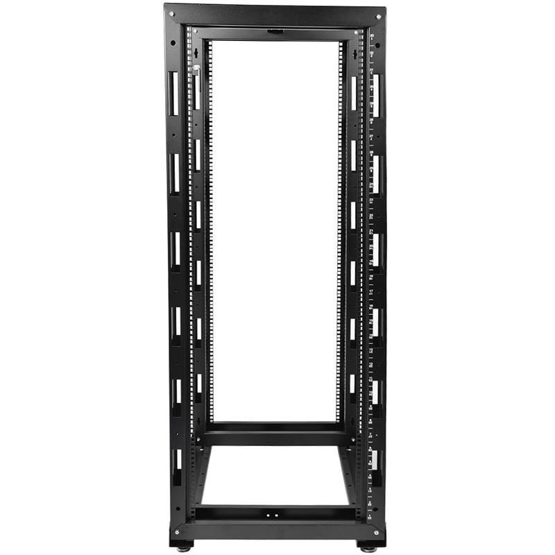 Стойка имеет полностью разборную двухрамную конструкцию, каркас повышенной жесткости скреплен болтами с внутренними шестигранниками. Вертикальные направляющие имеют юнитовую маркировку. Для удобства монтажа и коммутации оборудования предусмотрены развитая перфорация, широкий спектр аксессуаров и система заземления. Стойка имеет регулировку полезной глубины – 750/620/580/450 мм. При организации крупных коммутационных узлов возможно крепление стоек между собой через вертикальный кабельный органайзер. Удобство установки обеспечивают массивные опорные кронштейны и регулируемые винтовые опоры (ножки), компенсирующие неровности пола.