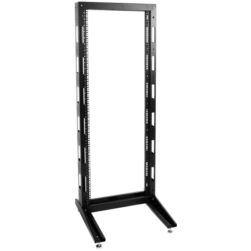 Стойка имеет полностью разборную однорамную конструкцию, каркас повышенной жесткости скреплен болтами с внутренними шестигранниками. Вертикальные направляющие имеют юнитовую маркировку. Для удобства монтажа и коммутации оборудования предусмотрены развитая перфорация, широкий спектр аксессуаров и система заземления. При организации крупных коммутационных узлов возможно крепление стоек между собой через вертикальный кабельный органайзер. Удобство установки обеспечивают массивные опорные кронштейны и регулируемые винтовые опоры (ножки), компенсирующие неровности пола.