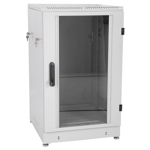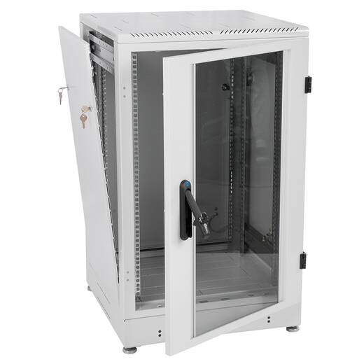 Шкаф имеет разборную каркасную конструкцию. Легок в сборке. Состоит из основания, крыши и двух сварных рам, соединенных комплектом швеллеров. На боковых элементах рамы выполнена дополнительная перфорация под закладные гайки. Шкаф комплектуется задней металлической стенкой и дверью. Дверь имеет как правую, так и левую навеску, угол открытия 180 градусов.