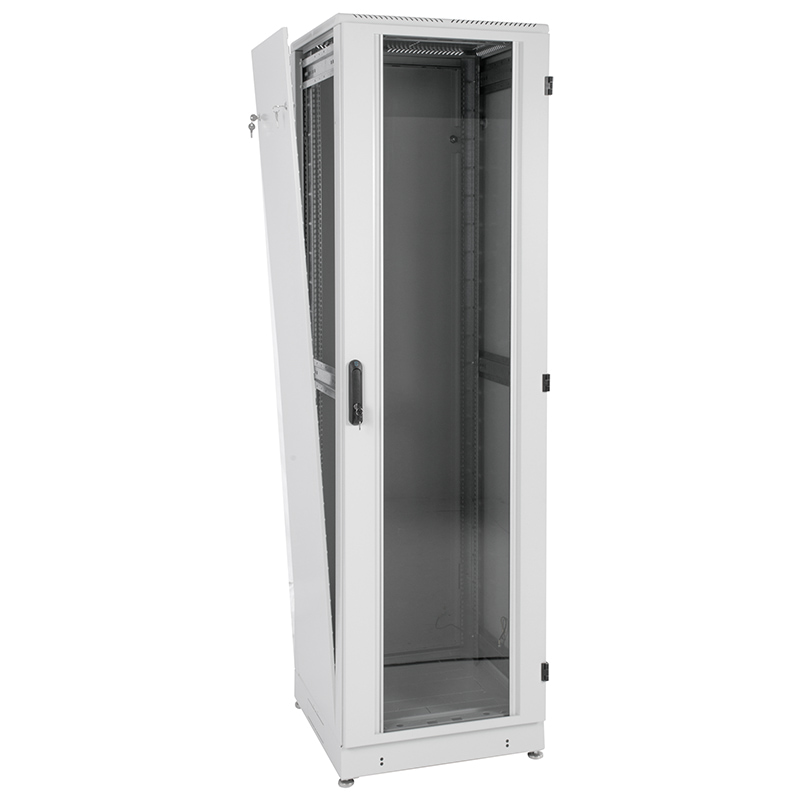 Шкаф имеет разборную каркасную конструкцию. Легок в сборке. Состоит из основания, крыши и двух сварных рам, соединенных комплектом швеллеров. На боковых элементах рамы выполнена дополнительная перфорация под закладные гайки. Шкаф комплектуется задней металлической стенкой и дверью. Двери имеют как правую, так и левую навеску, угол открытия 180 градусов.