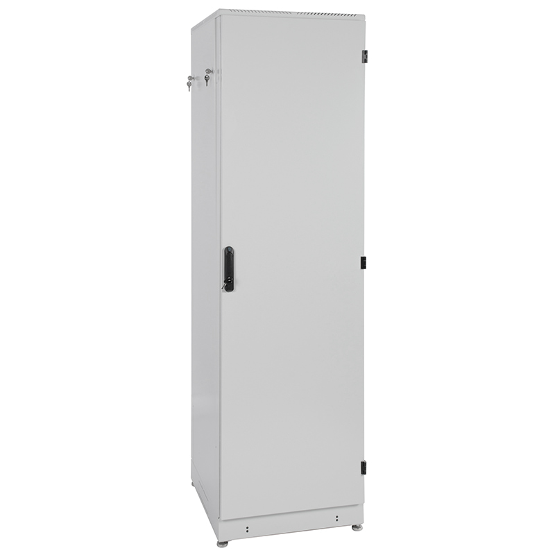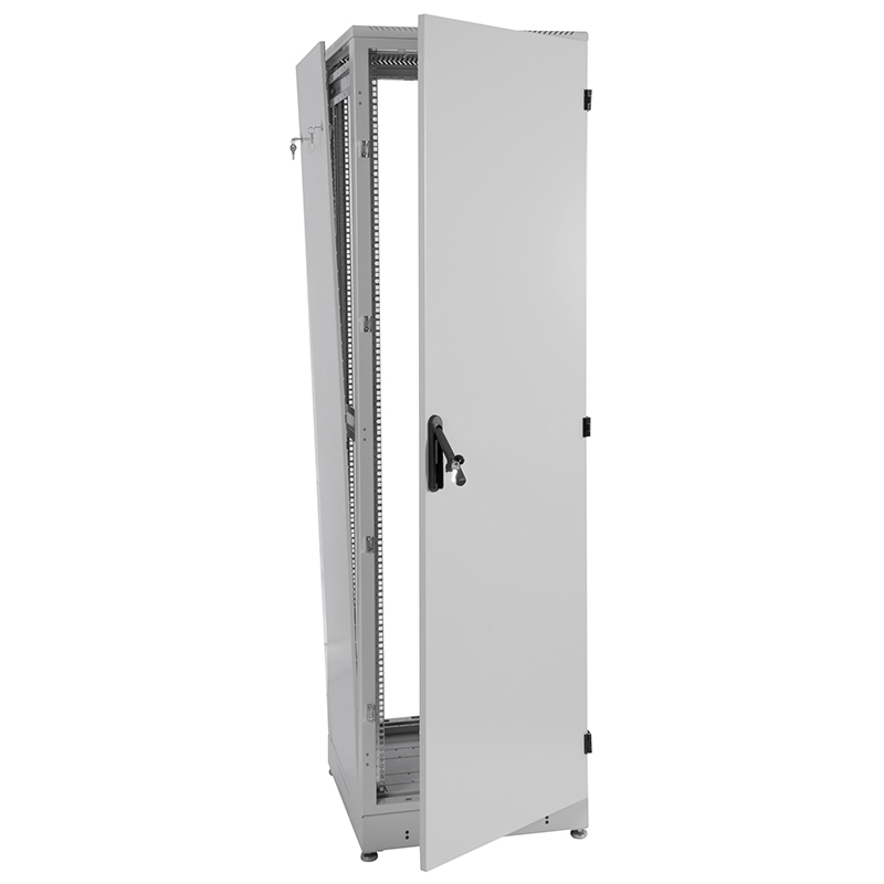 Шкаф имеет разборную каркасную конструкцию. Легок в сборке. Состоит из основания, крыши и двух сварных рам, соединенных комплектом швеллеров. На боковых элементах рамы выполнена дополнительная перфорация под закладные гайки. Шкаф комплектуется задней металлической стенкой и дверью. Двери имеют как правую, так и левую навеску, угол открытия 180 градусов.