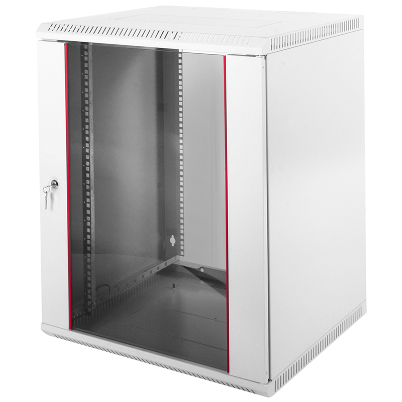 Возможна установка двери как с правой, так и с левой стороны. Дверь фиксируется точечным замком. Предусмотрены два кабельных ввода в верхней и нижней частях шкафа. Перфорация обеспечивает хорошую вентиляцию установленного оборудования. В основание или крышу шкафа возможна установка вентиляторного модуля. Для установки модуля демонтируется заглушка, и модуль фиксируется шестью винтами. Вертикальные направляющие регулируются по глубине. Система заземления входит в стандартную комплектацию. Возможна установка задней стенки.