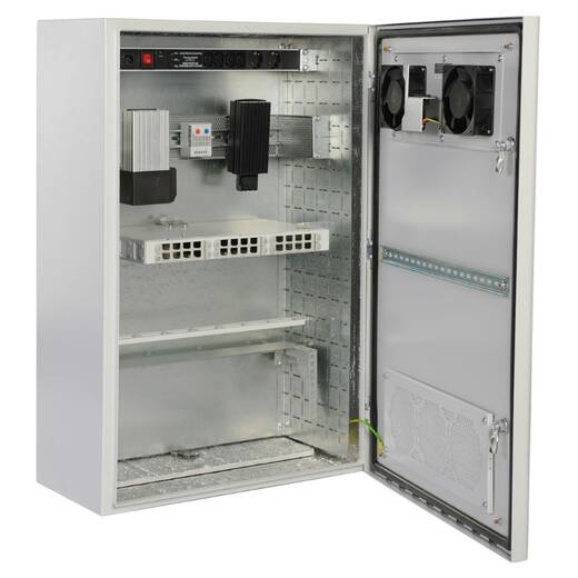 Корпус шкафа имеет металлическую сварную конструкцию, внутри покрыт термоизоляционным материалом. Дверь шкафа подготовлена для установки вентиляторов МВ-400-2 или МВ-400-2-3, фильтра МВ-Ф, а также имеется предустановленная DIN-рейка для установки нагревателей/термореле/гидростата/датчиков. В комплект шкафа входят задняя оцинкованная панель и комплект вертикальных юнитовых панелей 19".