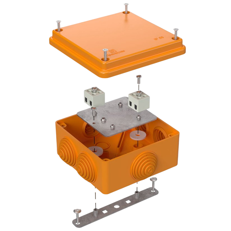 Коробка изготовлена из тепло- и огнестойких изоляционных материалов в соответствии ГОСТ 32126.1, подтвержденным испытанием методом раскаленной проволоки при температуре 650°C. Огнестойкость достигается наличием металлической пластины, керамических клемм и метизов, которые долго сохраняют свой функционал при возникновении пожара.