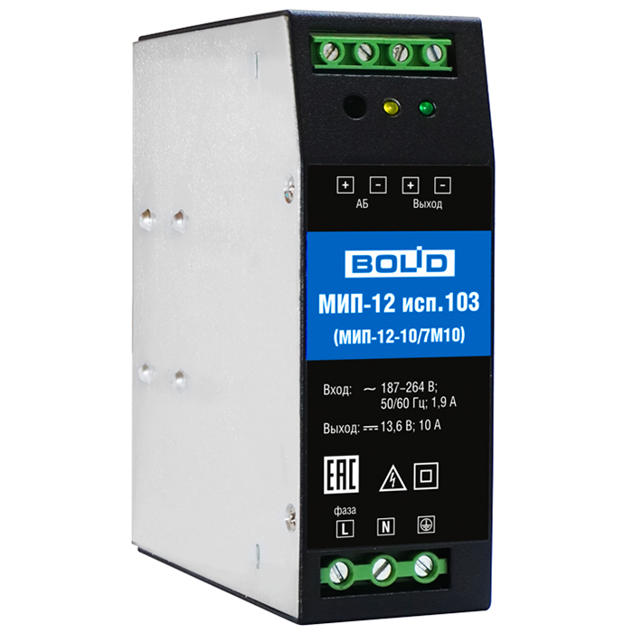 МИП-12 исп.103 – источник питания, предназначен для резервированного питания устройств автоматики, измерительного оборудования, телекоммуникационных систем, систем контроля доступа и видеонаблюдения, для размещения внутри монтажных устройств (шкафы, боксы и т.п.) на DIN-рейку.