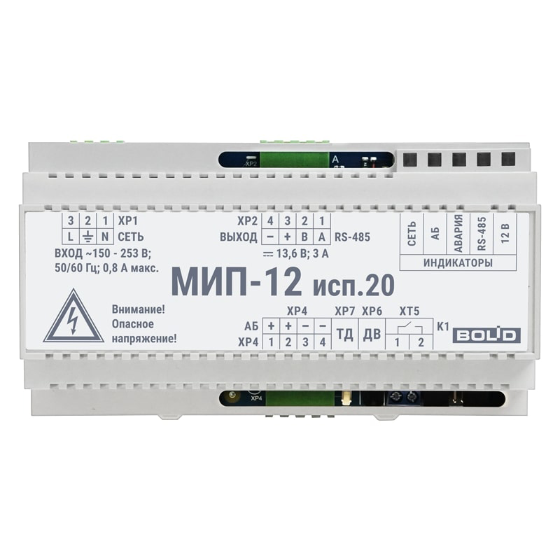МИП-12 исп.20 – модуль источника питания. Предназначен для размещения в монтажных устройствах с установкой на DIN-рейку и обеспечения резервированным питанием средств пожарной автоматики, извещателей, приборов ОПС, СКУД и других устройств. Рекомендован для организации питания БК-12-RS485-01, для совместного использования с ППКУП "Сириус", пульта С2000М и их исполнений.