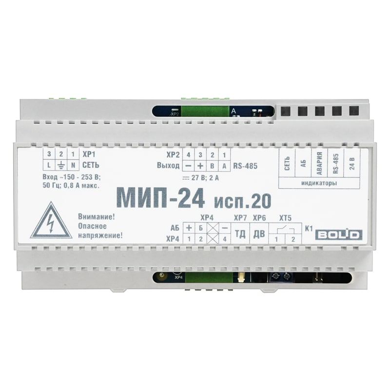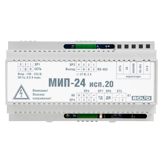 МИП-24 исп.20 – модуль источника питания. Предназначен для размещения в монтажных устройствах с установкой на DIN-рейку и обеспечения резервированным питанием средств пожарной автоматики, извещателей, приборов ОПС, СКУД и других устройств. Рекомендован для организации питания БК-24-RS485-01, для совместного использования с ППКУП "Сириус", пульта С2000М и их исполнений.