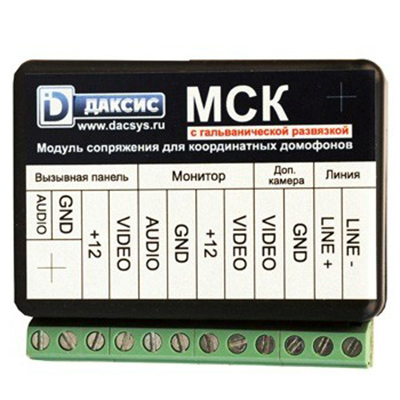 МСК-Г – модуль сопряжения с гальванической развязкой, предназначен для подключения индивидуального видеодомофона (COMMAX или полностью совместимого с ним) с линией связи общеподъездного домофона с координатной системой адресации абонентов (Визит, Цифрал, Элтис). Кроме того можно соединить линии аудиодомофона с четырехпроводной вызывной видео-панелью (для установки на этаж) и видеосигнал от подъездной видеокамеры.