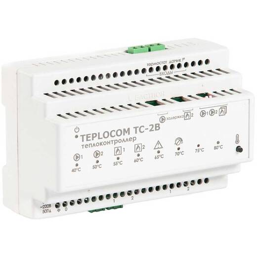 TEPLOCOM TC-2B – теплоконтроллер для управления системой водяного отопления, состоящей из 2 котлов и 2 циркуляционных насосов по сигналам от датчика температуры теплоносителя или комнатного термостата.