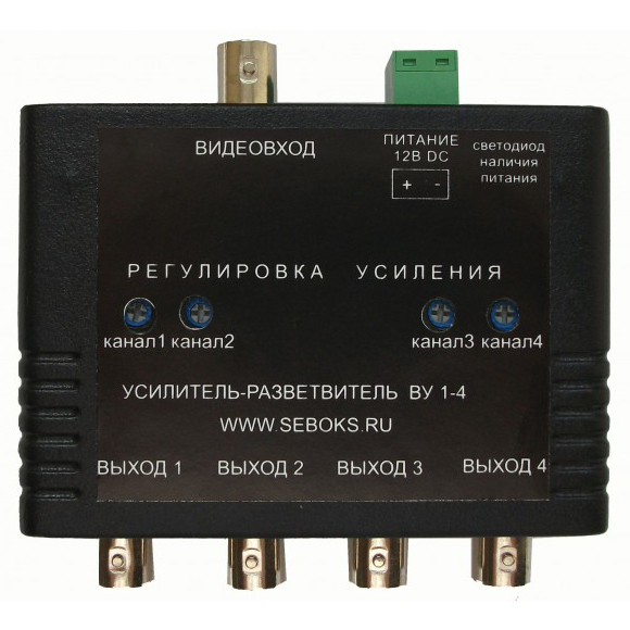 ВУ-1/4 – усилитель-разветвитель видеосигнала на 4 канала. Подстроечные резисторы располагаются на днище корпуса.