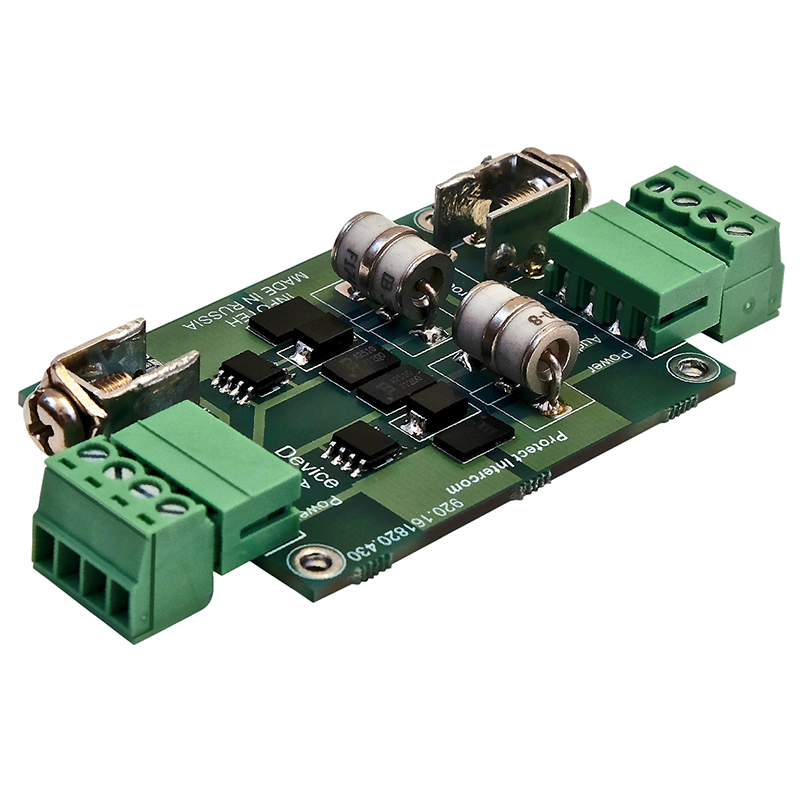 AVT-Protect Intercom – устройство многоступенчатой защиты видеодомофонов от грозовых разрядов, импульсных помех и перенапряжений. Защита цепей питания, видео, аудио, управления и общего провода видеодомофонов.
